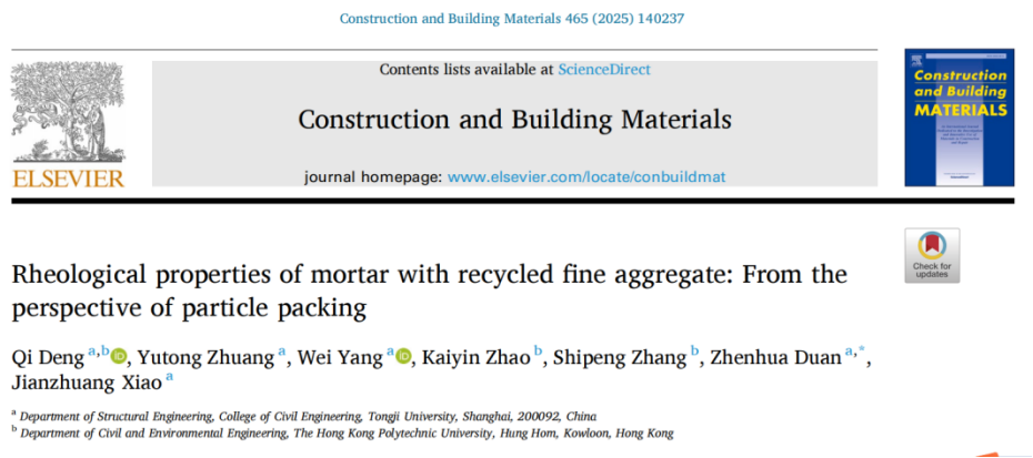 近期,学院段教授研究团队以《再生细骨料砂浆的流变性能:从颗粒充填的角度》为题的论文发表于国际期刊《Construction and Building Materials》(建设与建筑工程期刊)。