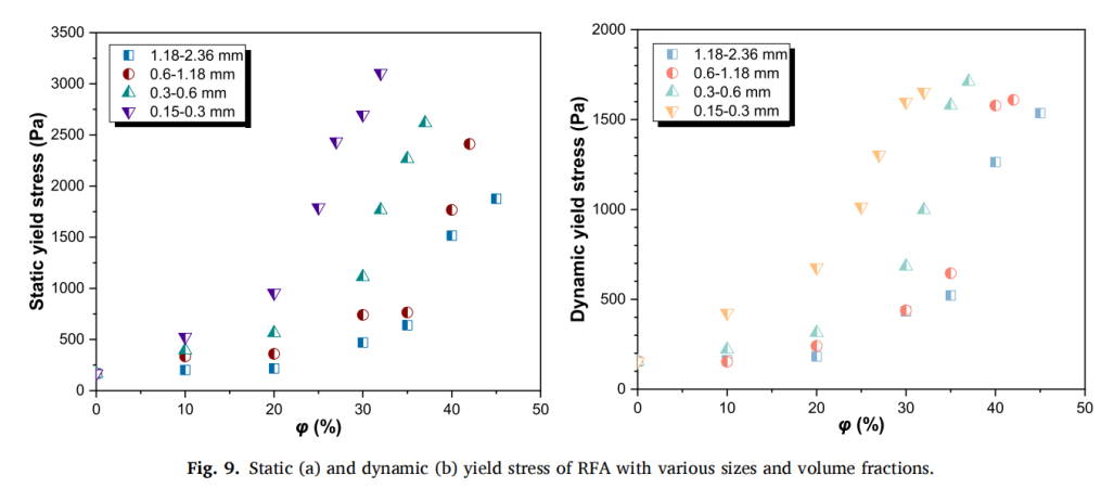 论文中展示的试验数据表明,低球度、高伸长率、高分形维数和高比表面积的细粒RFA无论在压实能量或水分条件下都具有较低的堆积密度。砂浆流变性能方面,相对塑性粘度与RFA体积分数呈正相关,与形态指标强相关。Quemada模型和Robinson模型的拟合结果均表明,剪切作用增强了颗粒体系的堆积密度。从考虑膏体-骨料或水-固相互作用的双相角度来看,RFA的不规则形状和粗糙表面特征导致了骨料或固体体系内堆积密度的降低,最终通过影响混合物中膏体或水的自由体积来决定宏观流动能力。因此,骨料特性对砂浆流变性能的影响可以通过颗粒充填行为来精确解释。