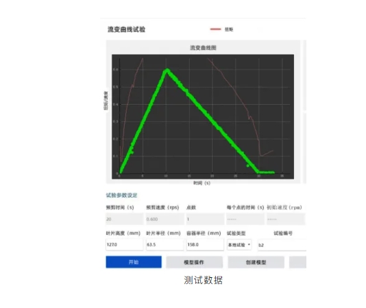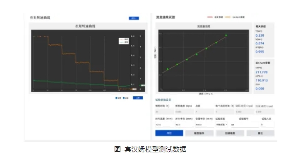 在流变阶段形试验中,转速从零增加击穿速度,保持击穿时间,以破坏触变结构。试验中转速根据设置逐级升高和降低,每级保持可设定的时间,通过宾汉姆流体或者幂流体规则计算剪切应力和剪切速率之间的关系。