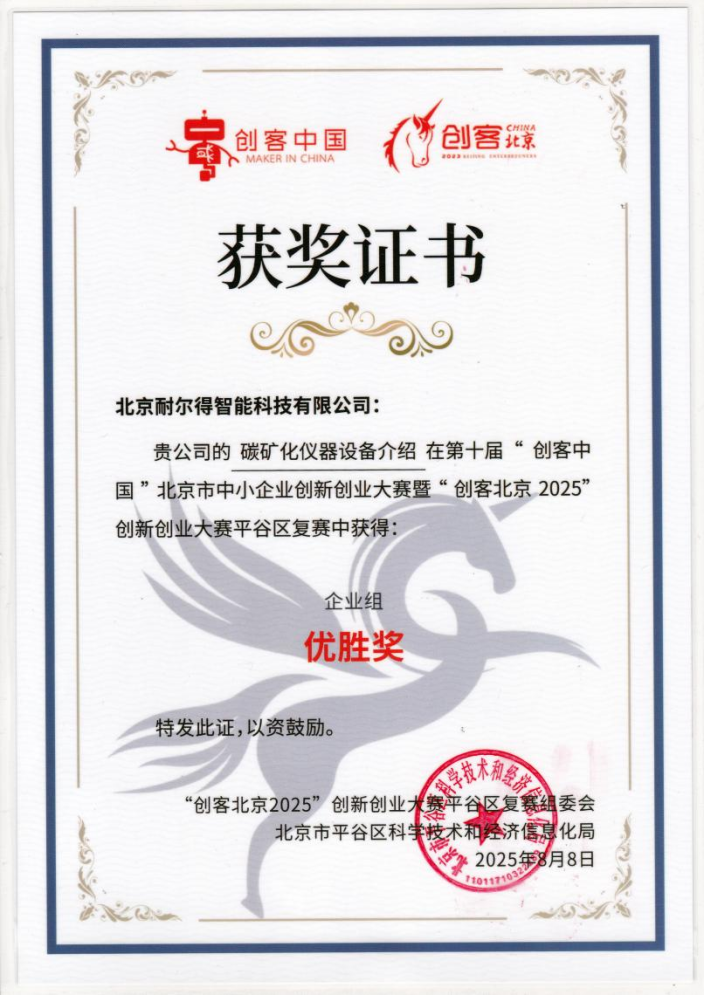 近日,在由北京市经济和信息化局、北京市财政局、北京市朝阳区人民政府共同举办的第十届“创客中国”北京市中小企业创新创业大赛暨“创客北京2025”创新创业大赛平谷区复赛中,北京耐尔得智能科技有限公司申报的“碳矿化仪器设备”项目,荣获大赛组委会颁发的“企业组优胜奖”。